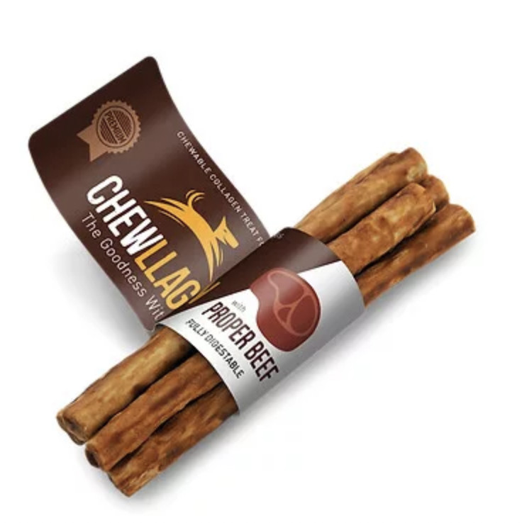Analitikai összetevők: nyersfehérje 70%, nyerszsír 4,5%, nyershamu 5%, nyersrost 0,5%, nedvességtartalom 15%. Adalékanyagok: színezék 0,01%, tartósítószer 1,01%. A Chewllagen a Dél-Amerikában legeltetett szarvasmarha bőréből kivont kollagénből készül. A kollagénfehérjék melegítés során lebomlanak, így kisebbek és könnyebben emészthetőek. A kollagént ezután formázzák és megsütik, így elnyeri kenyérszerű textúráját mielőtt valódi marhahúsba mártják. A marhatekercsek tele vannak az 1-es és a 3-as típusú kollagénnel. Ez segít serkenteni a porctermelést, tompítja az ízületeket és csökkenti az ízületi fájdalmakat. Nemcsak kutyája felépülését segíti hosszú séta után, hanem javítja izomerejét, erőnlétét.