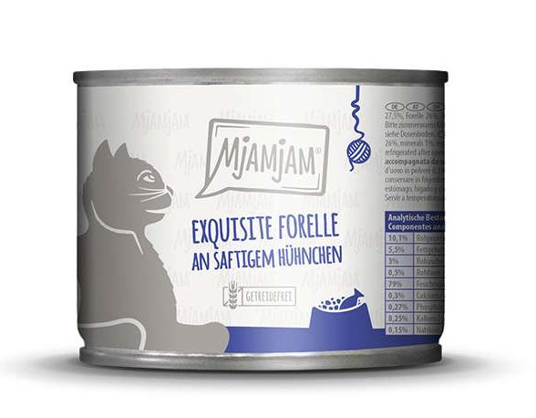 Csirkehús, -szív, -máj, -gyomor, -nyak 45%, húsleves 27,5%, pisztráng 26%, ásványanyagok 1%, tojáshéjliszt 0,5%