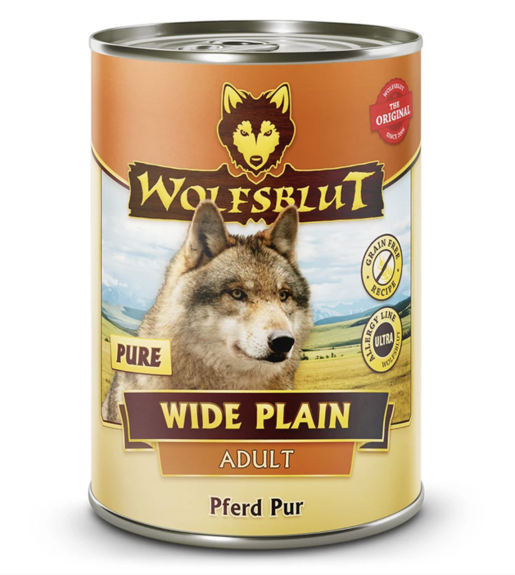 A Wolfsblut Wide Plain receptúrája friss lóhúst tartalmaz, amely kiváló minőségű, hipoallergén fehérjeforrás, és különösen ajánlott az ételintoleranciában szenvedő kutyáknak. A lóhús alacsony kalóriatartalmú, ugyanakkor vasban és kalciumban gazdag, ezzel támogatva az izomzatot és a csontozatot. Az édesburgonya, a fenyhel és a kaktuszfüge (nopal) természetes rostokkal és antioxidánsokkal látják el a szervezetet, míg az oregánó és a kakukkfű segíti az emésztést. Összetétel: lóhús (65%), húslé, édesburgonya (4,5%), zöldségek, édeskömény, kaktuszfüge (0,1%), gyógynövénykeverék (oregánó, kakukkfű). Analitikai összetevők: nyersfehérje 11%, nyerszsír 6,5%, nyershamu 1,9%, nyersrost 0,5%, nedvesség 78%. Adalékanyagok/kg: A-, D3-, E-, B-vitaminok, biotin, cink, réz, mangán, jód, DL-metionin, taurin.